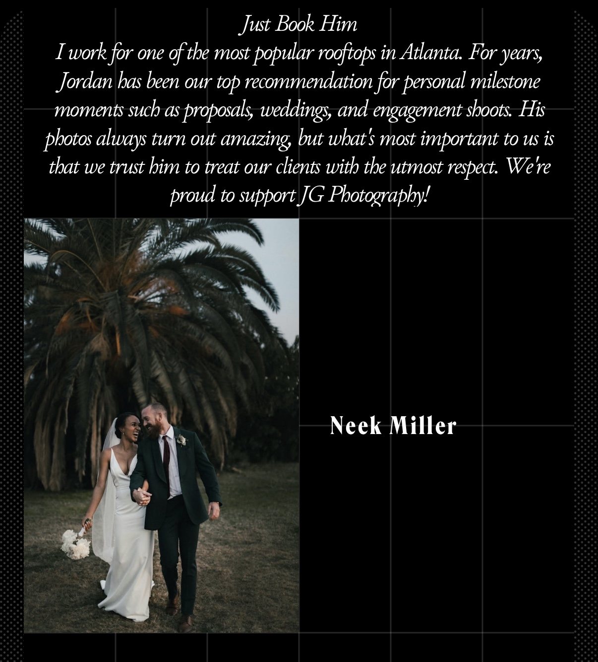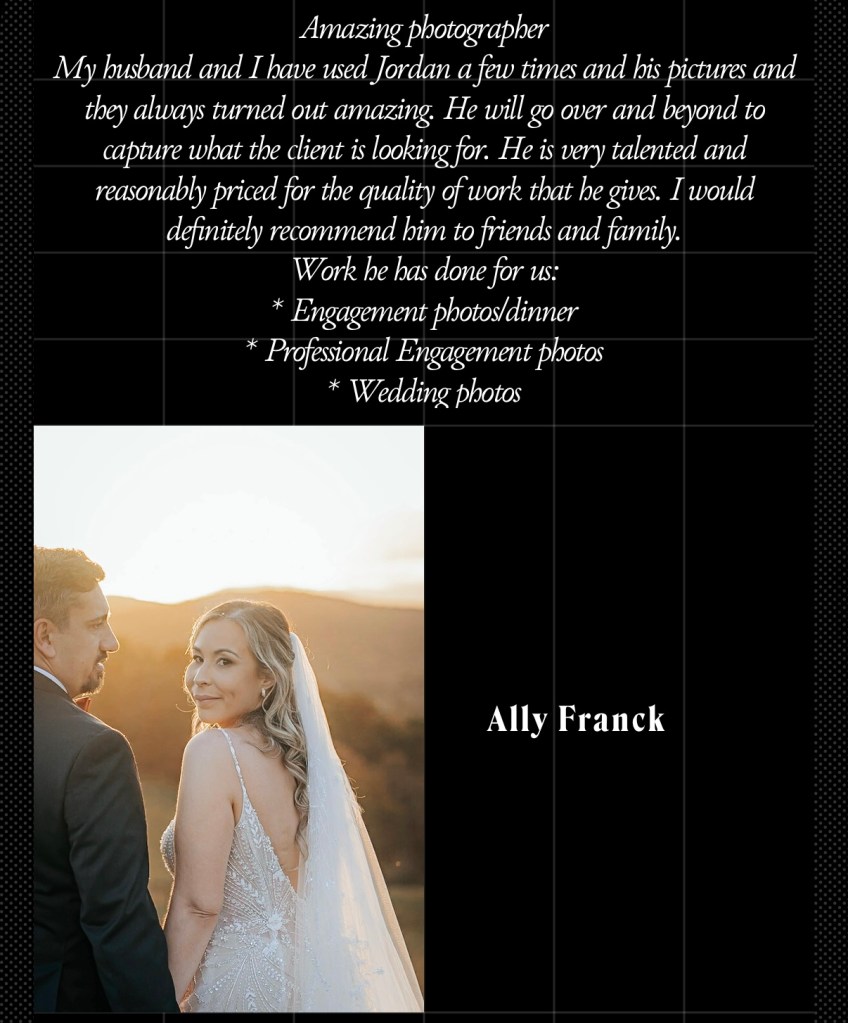 “Working with JD was an absolute pleasure all the way around. He made us feel comfortable right from the start and was able to capture those authentic moments in a professional manner, making those photos true instead of staged. He’s personable, on time, and someone I would absolutely book with again!.”